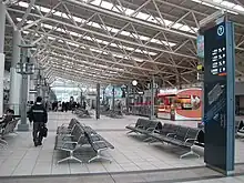 The KMRT portion of the station is a two-level station located underground,[15] at the northeastern part of the TRA/THSR station building.[11] The station has two exits[16] and opened for revenue service in March 2008. Dedicated exits between the KMRT station area to the TRA platforms allow direct transfer between TRA and KMRT trains. The KMRT part of the station has an island platform serving two tracks of the KMRT Red line.[15]