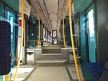 In one of the units near the door, there is a zone for disabled people, equipped with ramps for wheelchairs next to which there is also a toilet adapted for disabled people, equipped with a changing table for infants. The seats in the units are arranged in a group arrangement in the area of the high floors, and a line arrangement in the lower zone. The unit has 6 hangers for bicycles, electrical plugs, passenger information system, air conditioning and monitoring.[8]