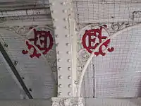 Newbury Park's most prominent feature is the bus shelter connected to the station entrance, designed by Oliver Hill in 1937, and opened on 6 July 1949. Distinguished by a copper-covered barrel-vaulted roof, the structure is a Grade II listed building and won a Festival of Britain architectural award in 1951. The award was marked by a plaque by the side of the shelter.[8][41] The LNER station building, which looked very similar to Chigwell (further north on the Loop),[21] was demolished in 1956 to facilitate widening of the adjacent A12 Eastern Avenue.[42][note 6] The station features GER insignia just beneath the platform canopies,[44] and has a London Transport canteen adjoining the entrance.[45][46]