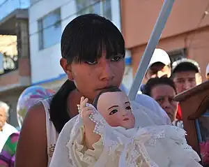 The traditions surrounding the image have not changed much in the over 400 years even though Xochimilco has transformed from a rural area to an urban one.[1] As it is associated with popular religious expression and because of this, it does not reside in a church but rather with a family.[1][4] It is part of popular religious expression and not official Church doctrine. Because of this, the image does not reside in a church but rather in the home of a family. He is “laid down to sleep” each night in a basket made for him, in his underclothes and wrapped in a blanket. Each morning, he is “awoken” to Las Mañanitas before he is dressed.[1] Each evening it attends Mass before heading back to the home of the mayordomo.[4] Since 1995, the image has been taken once a year for a “check up” with the “pediatrician,” which is annual examination, including X-ray and maintenance work done by INAH.[2] The image is hosted by a sponsor or “mayordomo” each year in the family home, often in a room built especially for the purpose. This area is open to the public with all free to come and go.[1][2] It is believed that those who become a mayordomo of the image receive blessings and prosperity.[3] The waiting list to host the image extends past 2040 and families have waited as much as fifty years.[2][7] If the person on the waiting list dies beforehand, the privilege is inherited by another member of the family.[3] Families who have hosted the image receive a life-sized copy.[7]