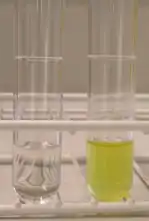 A niacin test strip is similar in appearance to a pH test strip. It is small, thin, rectangular, and white in color. Water is placed onto the culture plate and touched with a test strip for 15–20 minutes inside a small, sterile tube. If excess amounts of niacin are detected, the liquid inside the tube will turn yellow, a positive test. If the liquid in the tube is clear, there are no excess amounts of niacin and the test is negative.[6] A positive niacin test does not necessarily indicate the presence of M. tuberculosis because other Mycobacterium species can test positive for excess niacin.[6]