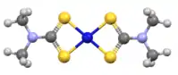 Nickel bis(dimethyldithiocarbamate) is the coordination complex on nickel and dimethyldithiocarbamate, with the formula Ni(S2CNMe2)2 (Me = methyl). It is the prototype for a large number of bis(dialkhyldithiocarbamate)s of nickel(II), which feature diverse organic substituents, all of which have similar structures. Nickel bis(dimethyldithiocarbamate) has been marketed as a fungicide and related complexes are used as stabilizers in polymers.[1]