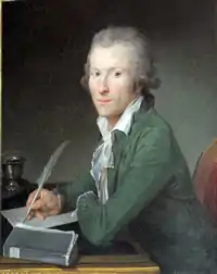 One of his paintings, Portrait of a Seated Gentleman, is the subject of some mystery. The well-executed portrait, dated 1785, shows an 18th-century gentleman sitting at a desk and beginning to write on a single sheet of paper. On the desk in the foreground is a copy of De la Caisse d'Escompte,[1] a financial pamphlet published on 17 May 1785 by the famous French orator and statesman Mirabeau.