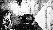 Within the room were suspended two hard-rubber plates covered with tin foil. These were about fifteen feet apart and served as terminals of the wires leading from the transformers. When the current was turned on, the lamps or tubes, which had no wires connected to them, but lay on a table between the suspended plates, or which might be held in the hand in almost any part of the room, were made luminous. These were the same experiments and the same apparatus shown by Tesla in London about two years previous, "where they produced so much wonder and astonishment".[120]