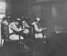 Her time in China was interrupted by World War I. Gage returned to the US to join the faculty of the "Vassar Training Camp" which offered an intensive short course in 1918 for women students wishing to help with wartime nursing.[4] Her work in Changsha then continued until about 1927 when political upheaval made it impossible for her to stay. There were other breaks from her service in China. In 1922 she was described as an "alumna" of Teachers College,[5] and she received an MA from the associated university, Columbia University, in 1925. She was elected president of the International Council of Nurses (ICN), representing China, for a four-year period while attending its 1925 conference in Helsingfors (Helsinki) where she presented a paper on adapting the nursing curriculum to local needs. This was praised in the American Journal of Nursing as showing Gage's "breadth and generosity of mind".[4] She was introduced to the nurses as "the first dean" of a school of nursing anywhere in the world and the announcement of her presidency was enthusiastically applauded: a high point in her career.[3]