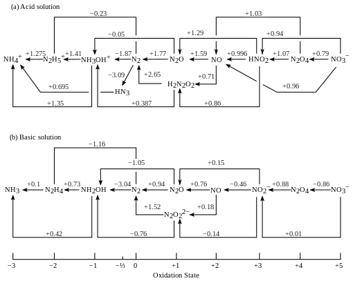 2, bent) solutions, although already at room temperature disproportionation to nitrate and nitric oxide is significant. It is a weak acid with pKa 3.35 at 18 °C. They may be titrimetrically analysed by their oxidation to nitrate by permanganate. They are readily reduced to nitrous oxide and nitric oxide by sulfur dioxide, to hyponitrous acid with tin(II), and to ammonia with hydrogen sulfide. Salts of hydrazinium N