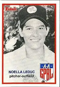 Noella Leduc (née Alverson; December 23, 1933 – August 22, 2014) was an American pitcher and outfielder who played from 1951 through 1954 in the All-American Girls Professional Baseball League. Listed at 5 ft 5 in (1.65 m), 130 lb, Leduc batted and threw right-handed. She was born in Graniteville, Westford, Massachusetts.[1]