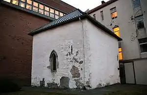 The Nonneseter Chapel (Nonneseter kapell) at Kaigaten 3 is believed to have been one of the choir chapels. It measures about 8 metres by 7 metres, and contains a vaulted ceiling and Gothic arched windows. It dates from around 1250, which seems to be when the church was extended. Between 1951 and 1989 it was used as a church for deaf persons. It is now used for various purposes, including as a concert hall. It is situated adjacent to the Nonneseteren station of the Bergen Light Rail and near the Bergen Public Library.[10]
