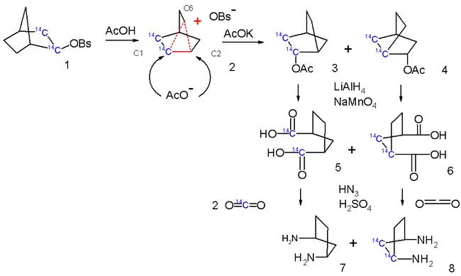 - 1 2 3 Roberts, J. D.; Lee, C. C.; Saunders, W. H. (1954). "Rearrangements in Carbonium Ion-Type Reactions of C14-Labeled Norbornyl Derivatives". Journal of the American Chemical Society. 76 (18): 4501. doi:10.1021/ja01647a001.