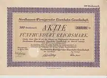 The Nordhausen-Wernigerode Railway Company (Nordhausen-Wernigeroder Eisenbahn-Gesellschaft) or NWE was the second railway company to be founded in the Harz mountains in Germany, after the Gernrode-Harzgerode Railway Company (Gernroder-Harzgeroder Eisenbahn). On 15 June 1896 the NWE was formed by the Vereinigten Eisenbahnbau- und Betriebs-Gesellschaft in Berlin, who also ran its operations. As early as 1896 the first section of this narrow gauge Harz Railway ('Harzquerbahn') was opened, followed in 1898 by the Brocken Railway (Brockenbahn), which was also narrow gauge. On 1 April 1908, the NWE took over operations from the Vereinigten Eisenbahnbau- und Betriebsgesellschaft.