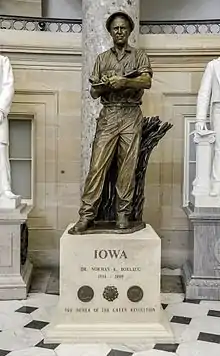 Norman Borlaug, or Dr. Norman E. Borlaug, is a bronze sculpture depicting the American agronomist and humanitarian of the same name by Benjamin Victor, installed in the United States Capitol's National Statuary Hall, in Washington, D.C., as part of the National Statuary Hall Collection. The statue was donated by the U.S. state of Iowa in 2014, and replaced one depicting James Harlan, which the state had gifted in 1910.[1]