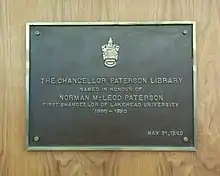 Chancellor Paterson Library plaque at Lakehead University