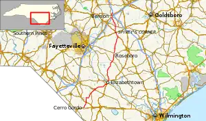 NC 242 is a 94.2-mile (151.6 km) long rural highway that goes from US 76 in Cerro Gordo, to I-40, near Benson. It passes through Columbus, Bladen, Cumberland, Sampson and Johnston Counties. Some major cities, and towns it goes through are Cerro Gordo, Bladenboro, Elizabethtown, Roseboro, Spiveys Corner and Benson.