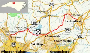 NC 65 is a 47.7-mile (76.8 km) rural highway from U.S. Route 52 (US 52) in Rural Hall, to US 158/US 29 Business (US 29 Bus.)/NC 87 in Reidsville. It passes through the counties of Forsyth (two instances), Stokes, Guilford, and Rockingham.[1]