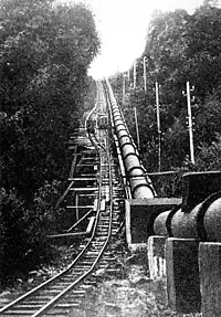 The line of the railway incline has today been replaced by a second pipeline, and the adjoining hillsides are wooded. However, there is a public footpath which ascends the hillside to the left of the pipeline, and in places the timberwork can still be seen. Today the pipeline in the left (when viewed from Dolgarrog) carries water from Llyn Cowlyd, the pipeline on the right carries water from Coedty reservoir.