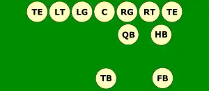 Players line up in T formation then shift to a box formation.[2] The Notre Dame Box differed from the traditional single-wing formation in that the line was balanced and the halfback who normally played the "wing" in the single-wing was brought in more tightly, with the option of shifting out to the wing. These two changes made the backs' formation resemble a square (hence "box") and made the formation less predictable, allowing offenses to run more easily to the "weak" side. Additionally, the halfback became a more viable runner than in the single-wing and the quarterback, normally just a blocking back in the single-wing, could become a passer since the center could snap the ball directly to him. The Notre Dame Box relied on a great deal of deception, caused by backs shifting frequently, rather than the pure power of the single-wing. Teams would often adopt the Notre Dame Box if they lacked a true "triple threat" tailback, necessary for effective single-wing use. Rockne's innovations with this formation involved using complicated backfield shifts and motion to confuse defenses, and adapting it as a passing formation. The formation was originally designed as a brute-force running formation, since it had seven players to one side of the center and only two on the other.