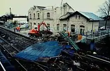 The station building was built of yellow bricks in 1870 together with the rest of the station. The station restaurant was closed in 1970 and the ticket office was closed 1975. The municipality of Nottuln acquired the heritage-listed entrance building in 1999. All attempts to sell the building, including over eBay, were unsuccessful.[5] On 18 January 2007, the roof of the station building was so badly damaged by extratropical cyclone Kyrill that it had to be demolished in April 2007 for safety reasons.