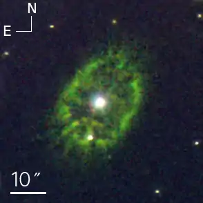 ![]() RGB composite color image of the shell surrounding the nova T Aurigae, made from three narrow band images: Blue = 4800Å, green = Hα at 6563 Å and red = [NII] at 6583 Å. From Santamaria et al. 2020[1] | |