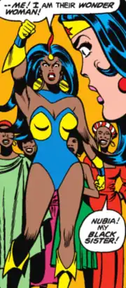 Nubia is a fictional character appearing in DC Comics publications and related media, commonly as an ally of Wonder Woman. Historically, she is DC Comics' first black female superhero. Originally introduced in 1973 as Wonder Woman's long-lost fraternal twin, today the character is depicted as one of Wonder Woman's oldest and closest friends. Created by Robert Kanigher and Don Heck, Nubia debuted in 1973's Wonder Woman #204 and appeared intermittently throughout Wonder Woman's Bronze Age adventures.[1]