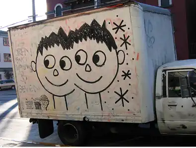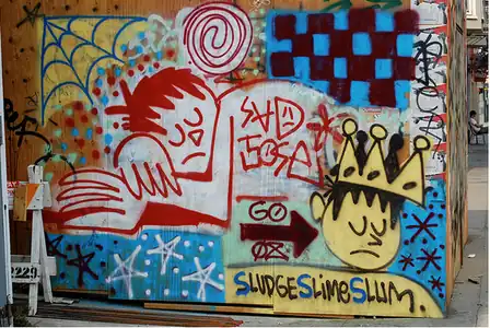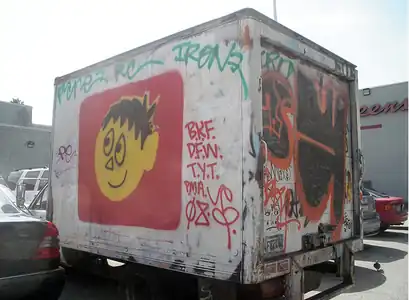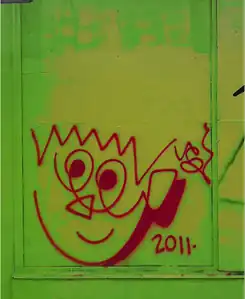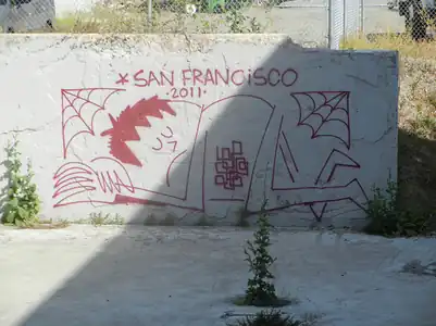 He was actively writing graffiti and making art in the Bay Area for over 25 years. ORFN used many alternate monikers, including Sad Jose, Helldiver, Muddguts, Chainsaw, Phantasmagoria, Hungry Waif, Vampire Wizard Zeus, and Very Viva Scout.[2] He gained notoriety for the number of San Francisco "bus flow" style tags he placed across the Bay Area, most of which were dated with the year in which they were done. However, his work evolved to include straightforward patterns and tone combinations that often featured smiling faces, sad children, cobwebs, skulls and other spooky imagery executed in a lo-fidelity, accessible, and playful manner. ORFN's work has drawn comparisons to that of Jean-Michel Basquiat. ORFN's work was very rarely included in formal displays.[1] ORFN was a member of a number of graffiti crews, including Under Shadows (US), Big Kid Fun (BKF), Down for Whatever (DFW), 640, and Big Time Mob (BTM).[3]