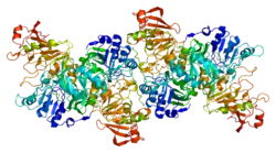 3-oxoacid CoA-transferase 1 (OXCT1) is an enzyme that in humans is encoded by the OXCT1 gene.[5][6] It is also known as succinyl-CoA-3-oxaloacid CoA transferase (SCOT). Mutations in the OXCT1 gene are associated with succinyl-CoA:3-oxoacid CoA transferase deficiency.[7] This gene encodes a member of the 3-oxoacid CoA-transferase gene family. The encoded protein is a homodimeric mitochondrial matrix enzyme that plays a central role in extrahepatic ketone body catabolism by catalyzing the reversible transfer of coenzyme A (CoA) from succinyl-CoA to acetoacetate.[6]