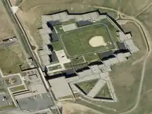 The prison is architecturally designed into the side of a hill to accommodate 481 inmates on a 160-acre (0.65 km2) site, which is connected by two corridors on separate levels. One of the corridors is used only for the staff, while the other corridor is used primarily for offenders and staff traffic, while the other 60 acres (0.24 km2) of this site are securely fenced in, with a large courtyard and baseball field in the center. Inmate cells measure 7 by 10 feet (2.1 by 3.0 m). Each cell contains a bed, table, toilet, and sink. The bed is a cement slab topped by a thin mattress. The toilet and sink are made of steel so they can't be broken. Each cell also has one rectangular window that's tall and thin. It is too narrow to escape through if the inmate could break the reinforced glass, and tests have proven it would take approximately twelve thousand hacksaw blades to cut through the steel bars of the prison. Not only does the prison provide a courtyard with a baseball field, but also includes an administration building, a religious resource room, gymnasium, security control center, staffed training fitness area, warehouses, a loading dock, and indoor firing range.