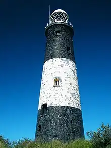 In 1895 both this low light and Smeaton's high light were decommissioned and replaced by a single lighthouse which still stands on the grass of Spurn Head. The 1852 low light also still stands on the sandy shore of the island, though its lantern has been replaced by a large water tank. (Of the old Smeaton high light only the foundations remain;[25] after dismantling, its optic was re-used in the high lighthouse at Nash Point, where it was installed as part of a programme of improvements.)[26]