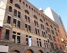 On the Fulton Street elevation of the facade, the first and second stories were originally clad with granite, with a light sandstone band above the second story; brick and terracotta are used on the upper stories.[6][18] The vertical quality of the Fulton Street facade is emphasized by the use of vertical piers, similar to in early skyscrapers. In addition, Lauritzen divided the facade into numerous arcades to give the facade a quality of intricacy.[17] The lowest two stories on Fulton Street have been renovated at least three times: in the 1940s, 1980s, and 2010s.[19] The Duffield Street elevation is similar, except that gray stone is used on the lowest two stories instead.[6][20]