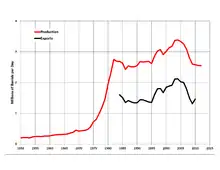 Between 1938 and 1971, Mexico's oil output expanded at an average annual rate of 6%.[33] In 1957, Mexico became a petroleum net importer after domestic demands exceeded domestic production. However, production rose to 177 million barrels (28.1×106 m3) by 1971 with the exploitation of new oil fields in the isthmus of Tehuantepec and natural gas reserves near the northeastern border city of Reynosa, but the gap between domestic demand and production continued to widen.