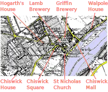 Not far away to the west are Hogarth's House and Chiswick House and Gardens; they are not in the Old Chiswick Conservation Area. Of the other constituent medieval villages of modern Chiswick, Strand-on-the-Green lies to the west; Little Sutton and Turnham Green to the north. The area is in the London Borough of Hounslow; to the northeast is Hammersmith Mall; across the river is Barnes.[1]