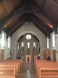 On a number of occasions, the demolition of the old church was contemplated. However, it was finally decided to restore it as a place of worship. Based on historical evidence, restoration was done to recreate the bell tower, the stone tracery in the windows and the timber shingle roof. A stained glass window depicting Jesus Christ and the story of St Stephen was placed in the west window. The furniture can be re-arranged to suit a variety of church services, weddings, spiritual talks and sacred music performances. The nave is separated from the apse by four timber panels and a rood bar with a crucifix in the midpoint. The apse space contains a shrine of Saint Mary MacKillop. On 5 February 1999, the church was re-dedicated as St Stephen's Chapel by Archbishop John Bathersby.[2]