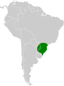The olive spinetail is found from southern São Paulo state in southeastern Brazil south through eastern Paraguay into northeastern Argentina as far as northern Corrientes Province. It inhabits humid forest, both prinary and secondary, and woodlands dominated by Araucaria. In elevation it ranges from near sea level to 1,000 m (3,300 ft).[5][6][7]