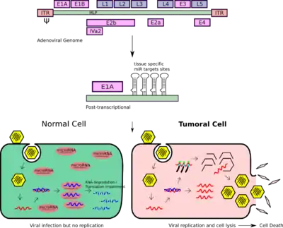 Another layer of regulation that has emerged to control adenoviral replication is the use of microRNAs (miRNA) artificial target sites or miRNA response elements (MREs). Differential expression of miRNAs between healthy tissues and tumors permit to engineer oncolytic viruses in order to have their ability to replicate impaired in those tissues of interest while allowing its replication in the tumor cells.