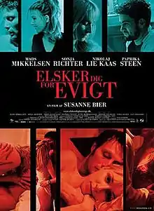 Open Hearts (Danish: Elsker dig for evigt), is a 2002 Danish drama film directed by Susanne Bier using the minimalist filmmaking techniques of the Dogme 95 manifesto. It stars Mads Mikkelsen, Nikolaj Lie Kaas, Sonja Richter and Paprika Steen. Also referred to as Dogme #28, Open Hearts relates the story of two couples whose lives are traumatized by a car crash and adultery.