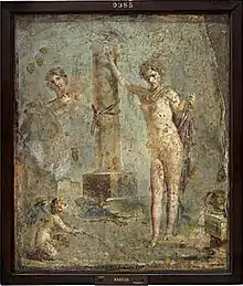 Like the nearby towns of Pompeii and Herculaneum, Oplontis was buried in ash during the volcanic eruption of Mount Vesuvius in 79 AD.[2] However, the force of the eruption was even stronger than at these cities as not only roofs collapsed, but walls and columns were broken and pieces thrown sideways.[3]