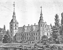 In the 13th century Orebygaard belonged to the crown and played an important role in the defence of the coast. The first private owner was Sivert Lauridsen, a nobleman, who owned the estate from 1315 to 1316.[1] A later owner was Erik Sjællandsfar, possibly an illegitimate son of Erik Menved, whose daughter Bodil Eriksdatter brought it into her marriage with Laurids Jensen Blaa. Their sons, Sivert and Oluf Lauridsen Blaa, divided the estate in two. This lasted until the beginning of the 16th century when Mads Eriksen Bølle obtained full ownership of the estate. Bølle supported the Catholic party during the Count's Feud and his estate was on several occasions looted by citizens from Sakskøbing. His grand daughter, Birgitte Bølle, brought Orebygaard into her marriage with Christoffer Gøye, a son of Mogens Gøye.[2] They were major landowners but had no children. Orebygaard was therefore passed on to one of Birgitte Bølle's more distant relatives, Axel Ottesen Brahe. whose son sold it to Jakob Ulfeldt in 1618. It was then owned by members of the Ulfeldt family until Sophie Ulfeldt brought it into the Holck family through her marriage to Christian Christopher Holck.[1]