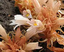 As a parasite taking its nutrients from a host plant, it lacks leaves and chlorophyll.