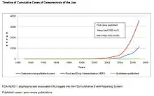 The first three reported cases of bisphosphonate-associated osteonecrosis of the jaw were spontaneously reported to the FDA by an oral surgeon in 2002, with the toxicity being described as a potentially late toxicity of chemotherapy.[12] In 2003 and 2004, three oral surgeons independently reported to the FDA information on 104 cancer patients with bisphosphonate-associated osteonecrosis of the jaw seen in their referral practices in California, Florida, and New York.[13][14][15] These case series were published as peer-reviewed articles – two in the Journal of Oral and Maxillofacial Surgery and one in the Journal of Clinical Oncology. Subsequently, numerous instances of persons with this adverse drug reaction were reported to the manufacturers and to the FDA. By December 2006, 3607 cases of people with this ADR had been reported to the FDA and 2227 cases had been reported to the manufacturer of intravenous bisphosphonates.