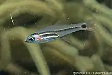 Ostorhinchus neotes, the mini cardinalfish, is a species of ray-finned fish, a cardinalfish, from the family Apogonidae. It is found in the western central Pacific Ocean from the Philippines south to Australia and has been reported from Tonga.[2] It is a small cardinalfish with a small semi-transparent body which has a black stripe along its flanks underneath the skin, and a large, black spot at the base of the caudal fin.[3] It occurs in lagoons and outer reefs where the water is relatively clear and normally where there are soft corals or gorgonian fans. It forms small schools, but mates in couples and the male mouth broods the eggs.[2] It shelters in crevices in the reef.[1]
