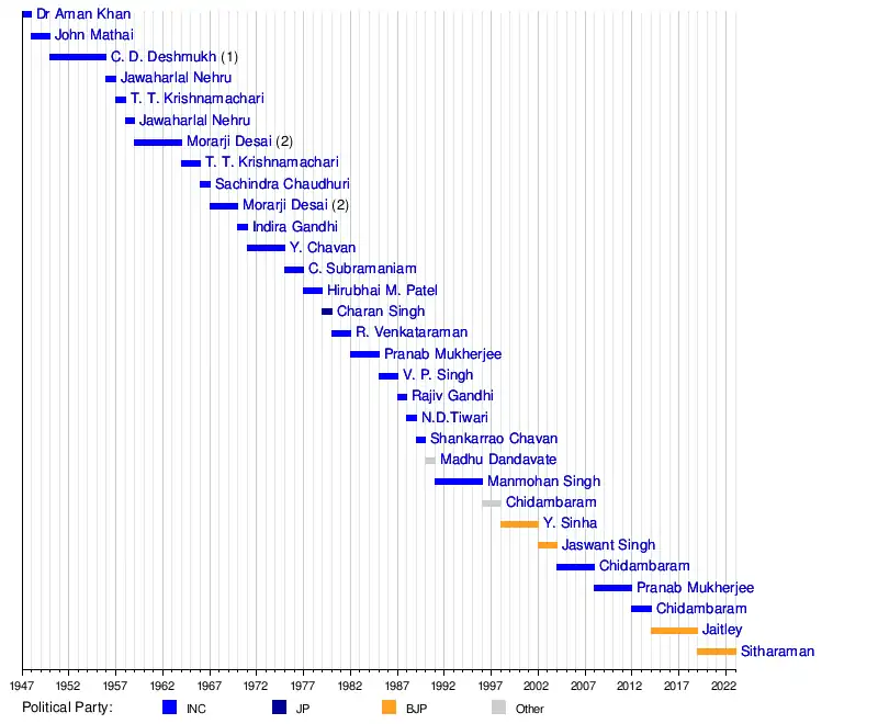 Nirmala SitharamanArun JaitleyP. ChidambaramPranab MukherjeeP. ChidambaramJaswant SinghYashwant SinhaP. ChidambaramManmohan SinghMadhu DandavateShankarrao ChavanRajiv GandhiV. P. SinghPranab MukherjeeR. VenkataramanCharan SinghHirubhai M. PatelChidambaram SubramaniamYashwantrao ChavanIndira GandhiMorarji DesaiSachindra ChaudhuriT. T. KrishnamachariMorarji DesaiJawaharlal NehruT. T. KrishnamachariJawaharlal NehruC. D. DeshmukhJohn Mathai