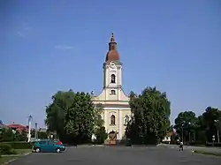 The church was completed in the 1790s.[17] Wall paintings, including pictures of the church itself and Esztergom Basilica on each side of the triumphal arch, come from 1843. The single-aisle body of the church is vaulted with two fields of Prussian vaults. Rotating stairs in southern part of the church lead to the three-axis matroneum above, containing an organ. The communion table, sanctuary and seats for celebrants are located in the northern part of the church. The room above sacristy holds seats, reserved in the past for patrons and nobles. There is a wooden Classicist altar from 1800[18] with a modern statue of the Sacred Heart located in the right part of the triumphal arch and a preserved original Classicist pulpit with conic tribune and canopy on the left. The statue of the Immaculate Heart of Mary on the left and statue of the Sacred Heart on the right decorate the façade of the yellow-white building. The church tower holds a belfry and the mechanism for the functional tower clock.
