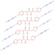In order to meet the geometric requirements for polymerization, a host–guest strategy is used by combining a host molecule and diiodobutadiyne in solution and allowing co-crystallization to occur. This can be utilized because hosts that are most commonly used are able to bond to the diyne monomer by halogen bonding from the lewis acidic iodine atom to a lewis basic nitrogen of the host (usually a nitrile or pyridine). In order to give a proper repeat distance to the monomers (5 Å), the hosts also contain oxalamide groups that create a hydrogen bonding network throughout the crystal.