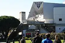 The Guide to Architecture in the San Francisco Bay Area of 1975 describes it with a single line: "Little more than a concrete moon viewing platform built for the Architect himself". Subsequently, the house has undergone a significant series of renovations and additional construction that no longer hint at its minimal beginnings. A symmetrical concrete pavilion stands atop a platform-like base, on which the "body" of the house is then supported by eight poured-in-place concrete columns that extend down to the topography running continuously below the floor. Domestic "space" occupies the sandwich between the two equally disposed square concrete slabs. The perceived thinness of the planes is achieved by means of an interlocking grid of post-tensioned concrete beams set both above the roof and below the floor to ensure the provision of uniform, column free "universal space" trapped between. Vertical supports are held back from the corners, allowing the ends to be cantilevered in space.[5][6] Clear spanning glass panels, fixed and movable span vertically between the slabs, sliding open to the view, the fog and the breeze while allowing movement out onto open, covered terrace areas outside the glass envelope. The house was used briefly as a set for a locally produced feature film called the Crazy Quilt in 1966, made by John Korty who, as a neighbour, watched the house being built of poured cement and was inspired to write the screenplay of a man who loses houses to fire, earthquake and termites, then builds one that cannot be destroyed. Rocker Sammy Hagar rented the house in the mid-1970s, then bought it in 1977 with an advance from his album Musical Chairs. He continues to live in it.[7]