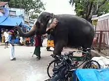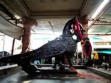 One of the main traditions of the temple, is the tonsuring of devotees, who vow to discard their hair in imitation of the form that Kartikeya assumed here. Another is the anointing of the head of the presiding deity's idol with sandalwood paste, at night, prior to the temple being closed for the day. The paste, upon being allowed to stay overnight, is said to acquire medicinal properties, and is much sought after and distributed to devotees, as rakkāla chandaṇam.[9] Traditionally, the hill-temple of Palani is supposed to be closed in the afternoon and rather early in the evening to permit the deity to have adequate sleep, being but a child, and therefore, easily tired by the throngs of devotees and their constant importunations. A tradition that is not very well known is that of the Paḷḷi-Arai or bedroom, wherein, each night, the Lord is informed of the status of the temple's accounts for the day, by the custodians of the temple, and then put to sleep to the singing of an ōdhuvār or bard. Devotees carry kavadi, an ornamental mount decked with flowers, glazed paper and tinsel work and wearing ochre clothes themselves on foot from long distances is a commonly followed worship practice.[10]