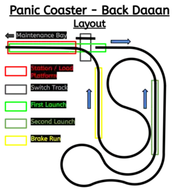 The physical track layout is fairly minimal; various twists and turns are navigated close to the room's floor, and the attraction's second launch is located halfway through the layout to keep the train moving. At the end of the layout, the train is slowed by a brake run and utilizes a switch track to re-enter the station from the same way that it left it. As a direct result of this, the train will be facing the opposite direction that it had been facing when leaving the station beforehand.