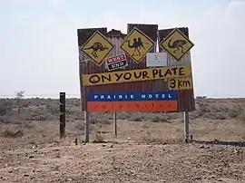The Prairie Hotel is the only substantial building in the town, dating from the days when the rail was supreme. Away from the highway, the hotel fronts the railway line and the now derelict station building. The sandstone and limestone building has been in part retained, in part restored and extended. There are now no passengers on the line that once ran from Adelaide to Marree and connected with the old Ghan line to Oodnadatta and Alice Springs. The hotel's patrons come by car or bus. Local Aboriginal artwork decorates the lounges and dining room and there are displays of the nearby Ediacaran fossils.