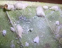 The adult female has a yellowish segmented, flattened oval body about two millimetres long covered with mealy wax. There are a number of short waxy filaments projecting around the margin. The ovisac is well developed and visible underneath the posterior part of the body. Sometimes the wax looks like cotton wool and oozes drops of fluid. The adult male is pinkish and about one millimetre long, with well-developed wings each marked with a small basal vein.[1] The antennae have eight segments in both sexes, a characteristic which distinguishes this species from the hibiscus mealybug (Maconellicoccus hirsutus).[2]