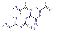 Paracyanogen is a polymer of cyanogen. It can be best prepared by heating mercuric cyanide. It can also be prepared by heating silver cyanide, silver cyanate, cyanogen iodide or cyanuric iodide.[12] It can also be prepared by the polymerization of cyanogen at 300 to 500 °C (572 to 932 °F) in the presence of trace impurities. Paracyanogen can also be converted back to cyanogen by heating to 800 °C (1,470 °F).[9] Based on experimental evidence, the structure of this polymeric material is thought to be rather irregular, with most of the carbon atoms being of sp2 type and localized domains of π conjugation.[13]