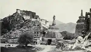 As shown by photographs taken in 1904 and 1938, the Pargo Kaling chorten was one of three chortens: a second one was perched on the low ridge of Marpori and a third one stood on the low ridge of Chagpori.[1] From the top of the middle chorten, wires furnished with small bells were stretched to the top of the two smaller chortens.[5]