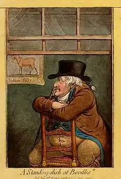 Before his next appearance in the Derby the colt was bought for 2,000 guineas by Lord Foley who named his acquisition Paris.[7] At Epsom on 22 May he started the 5/1 second favourite in a field of twelve runners. Paris's former owner, Frank Standish, had the favourite for the race, an unnamed chestnut filly by Mr Teazle who started at 7/2. The race attracted a large and fashionable crowd including the Prince of Wales with his friends Lord Darlington and Sir John Lade. The early pace was fast, with Lord Egremont's colt Trafalgar running strongly but John Shepherd on Paris keeping his horse under restraint until the turn into the straight. In the last quarter mile Trafalgar and Paris pulled clear and raced "neck and neck" throughout the final furlong until Shepherd made a "desperate push"[8] in the last strides to win by a head.[9] Two days after the Derby, and racing over the same course and distance, Paris incurred his first defeat in a Produce Sweepstakes. After "a fine race"[10] he finished second of the three runners to an unnamed colt (later named Canopus) to whom he was conceding five pounds.[11]